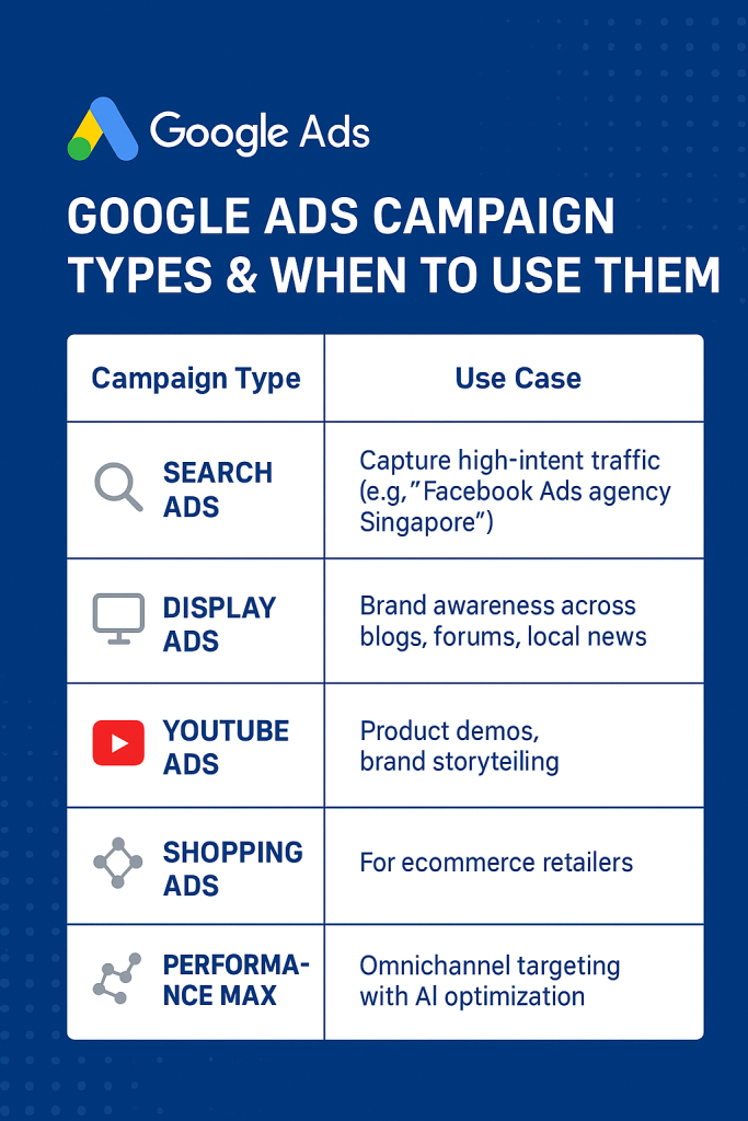 | Search Ads | Capture high-intent traffic (e.g., “Facebook Ads agency Singapore”) |