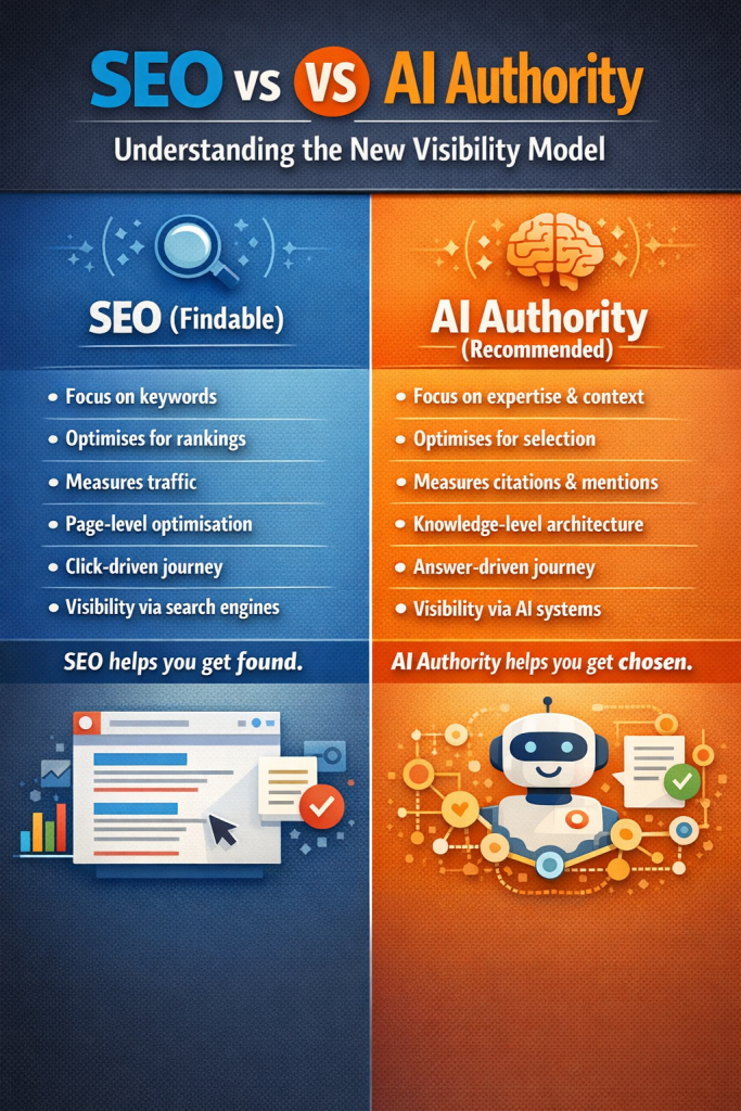 It means that traditional SEO strategies like keyword optimisation and rankings are no longer sufficient. Today, content must also be trusted, structured, and selected by AI systems to remain visible.